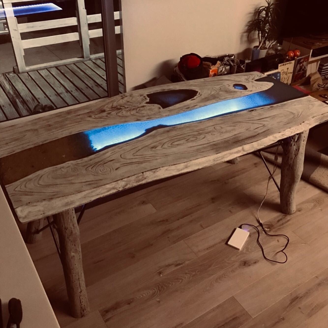 中棚の中にLEDイルミネーションライトが入っておりテーブルのレジンを七色にライトアップします!