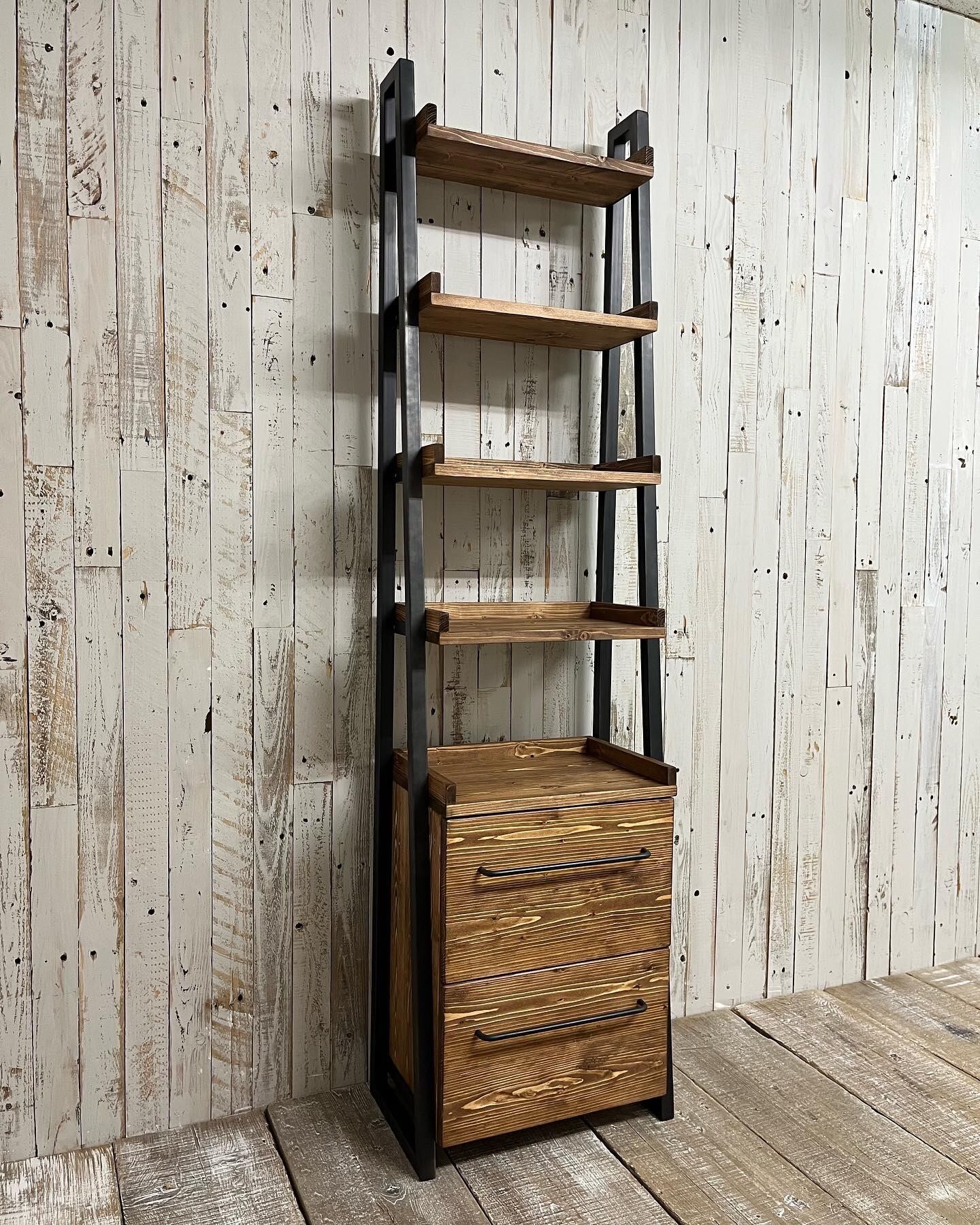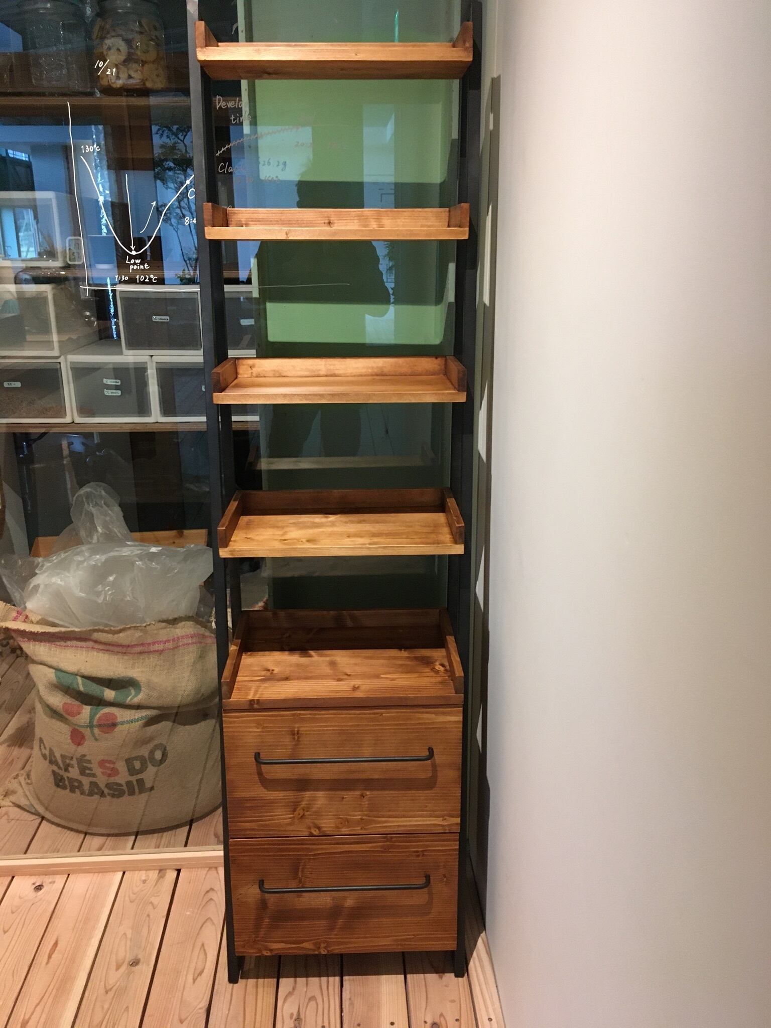 木製の棚板は階段状になっているため、棚板が奥まで見通せるようになっており、置いた物が落ちないように落下防止の側板を付けてあります。