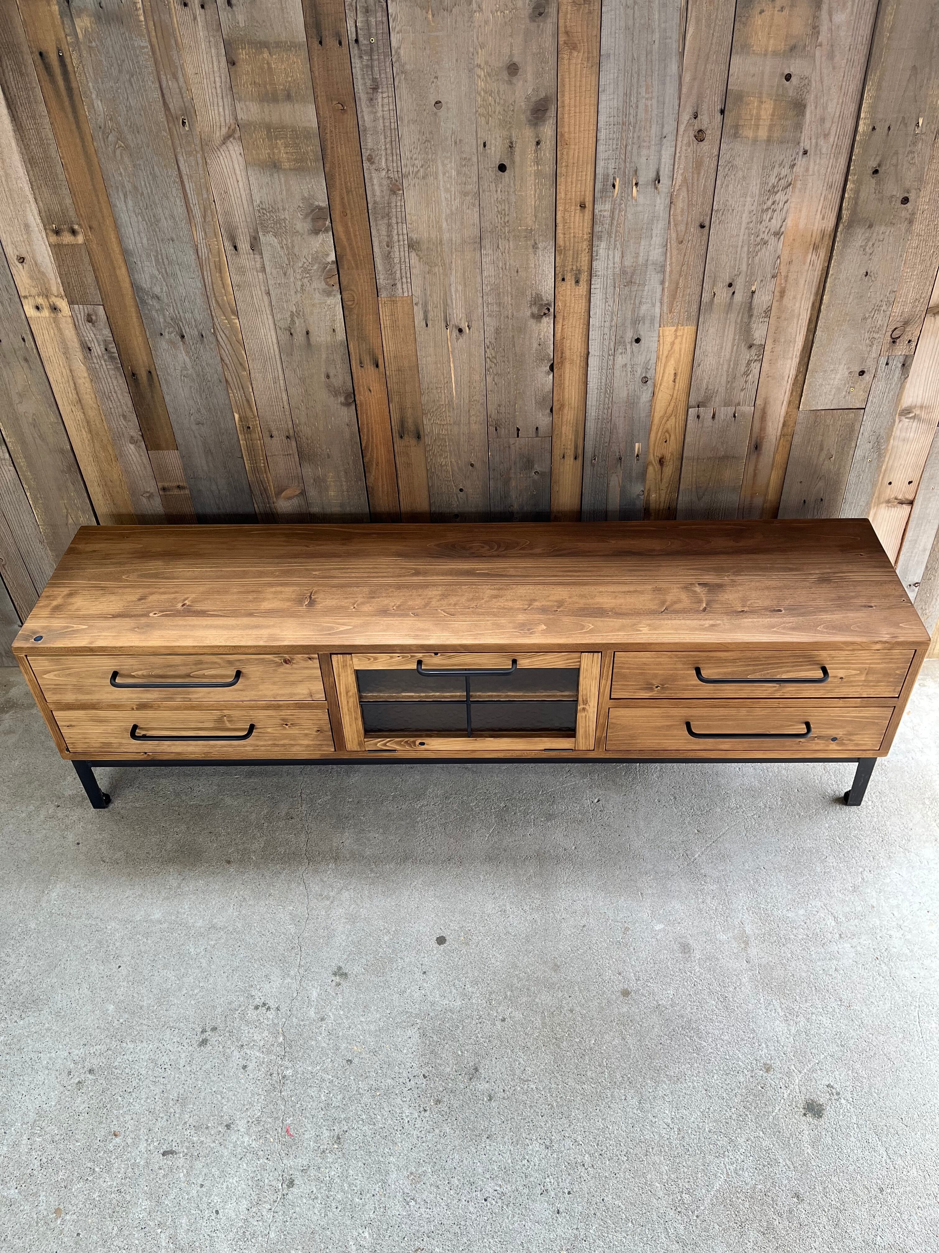 中央扉のサハラガラスとクロスアイアンをアクセントとし、木材の抜け節や欠けをあえて活かしてブルーレジンで穴埋めした個性あるテレビボードとなっております。
